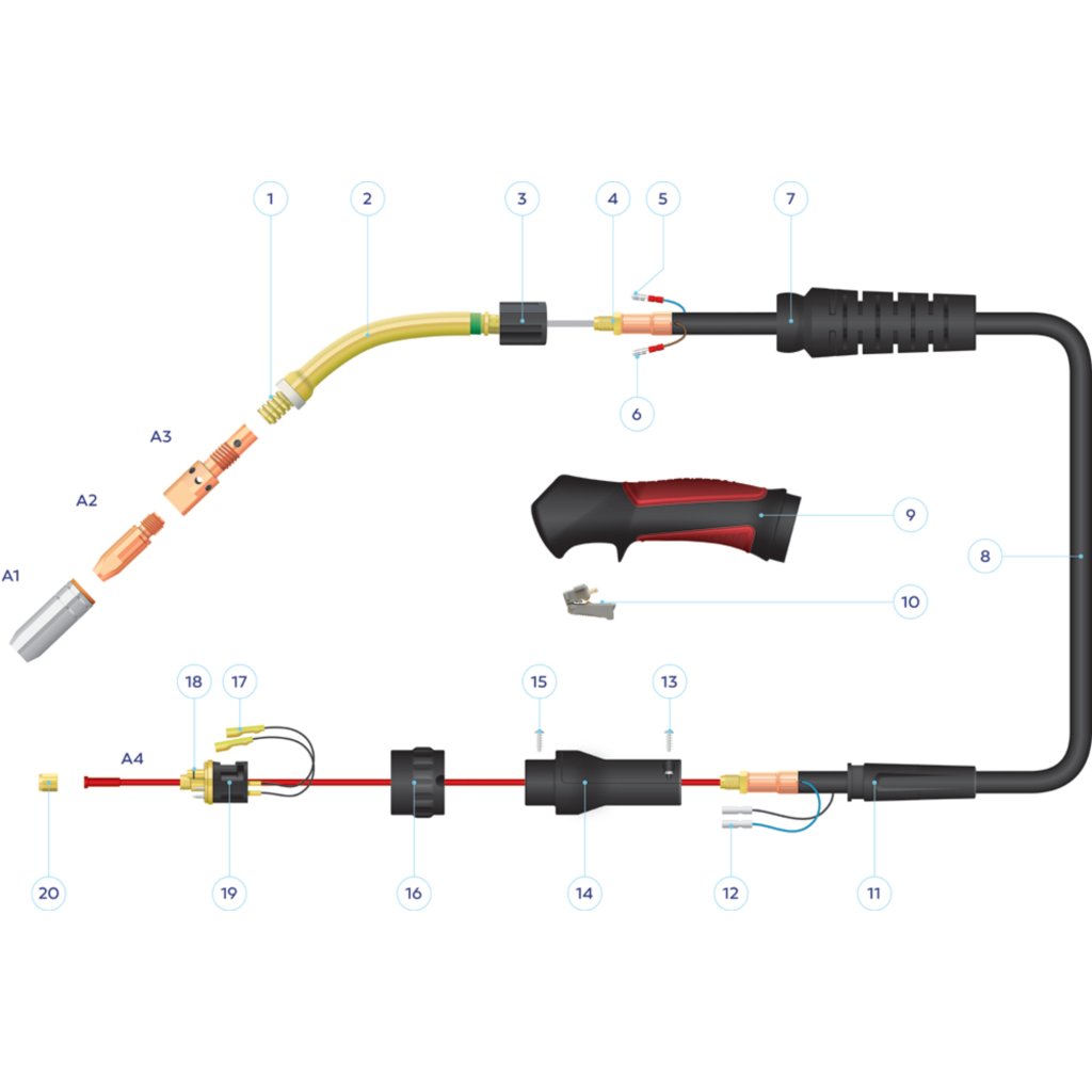 Kvalitní MIG/MAG svařovací hořák chlazený vzduchem, v délce 3, 4 a 5m.