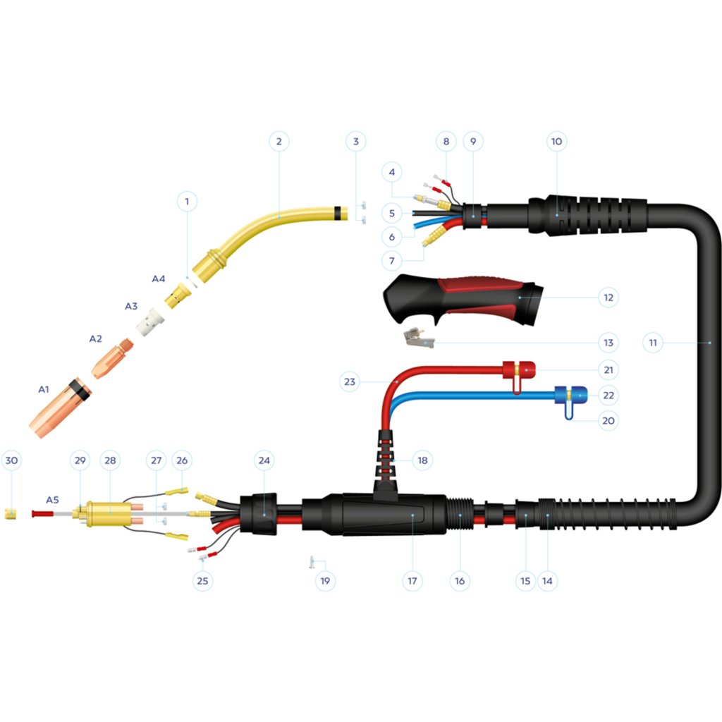 Kvalitní MIG/MAG svařovací hořák chlazený kapalinou, v délce 3, 4 a 5m.
